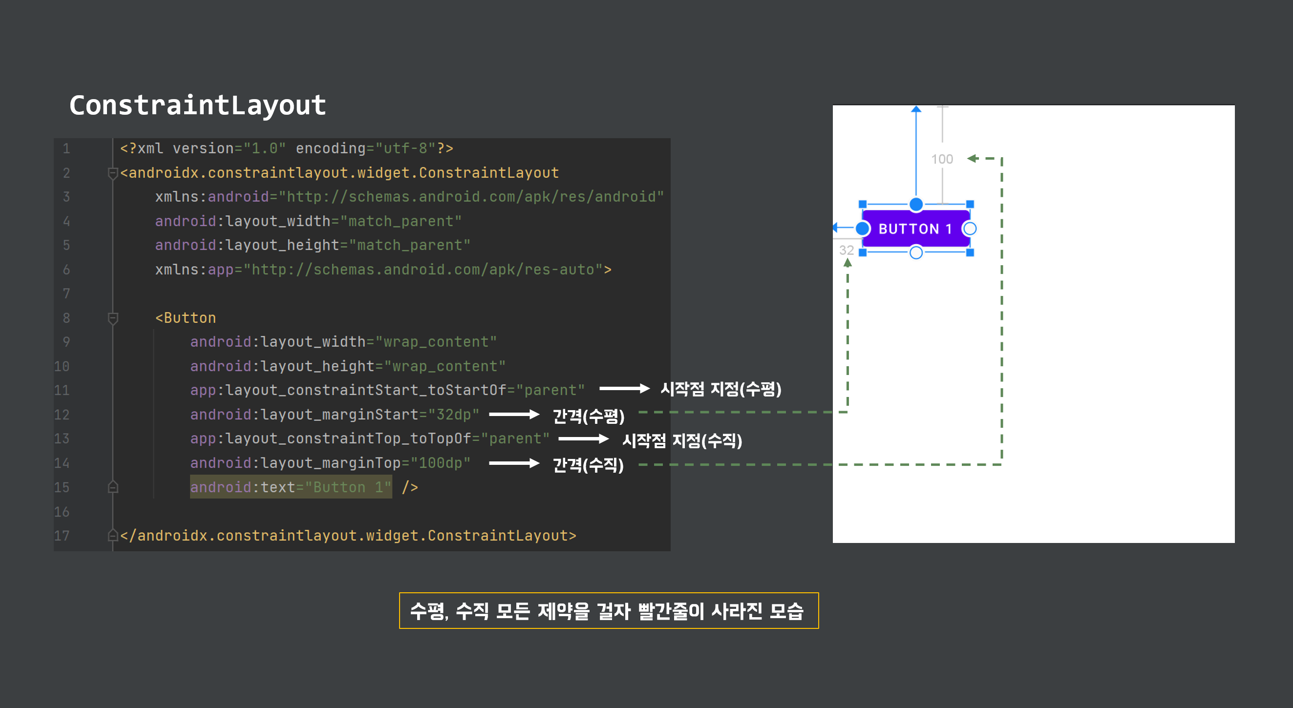 이는 ConstraintLayout의 특징으로 수직과 수평 방향 모두 제약을 걸어야한다.