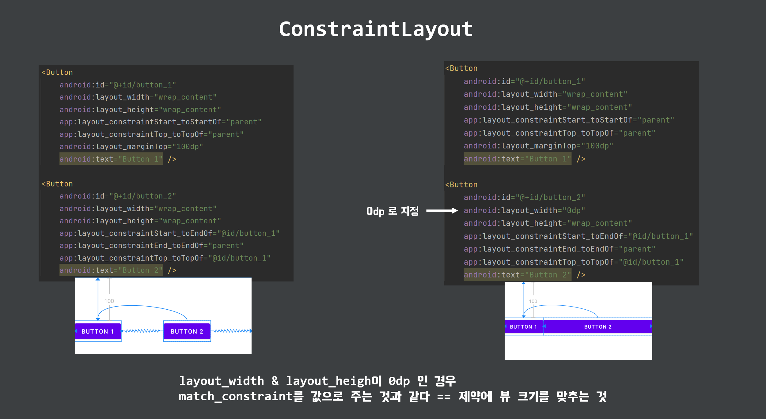layout_width & layout_heigh이 0dp일 경우 match_constraint를 값으로 주는 것과 같다. 즉, 제약에 뷰 크기를 맞추는 것이다.