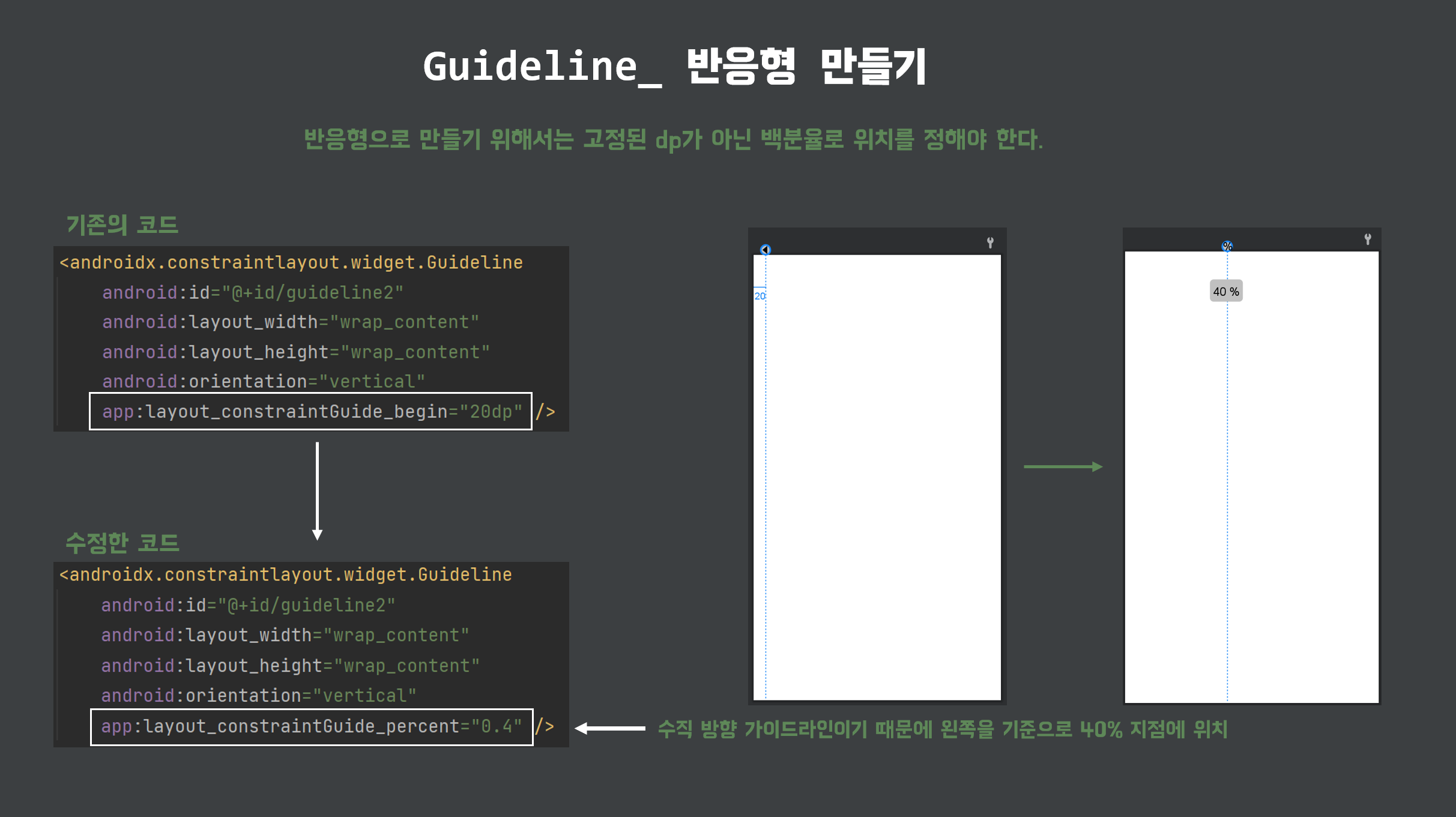 app:layout_constraintGuide_percent="0.4" → 수직 방향(vertical) 가이드라인이기 때문에 왼쪽을 기준으로 40% 지점에 위치